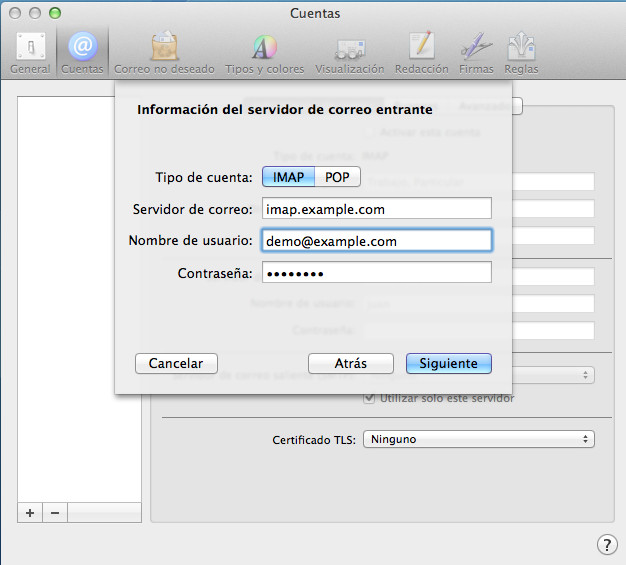 • Servidor entrante: nombre del servidor de recepción de correo (IMAP, para este caso).  Indica tu dominio junto con su extensión, por ejemplo dominio.com