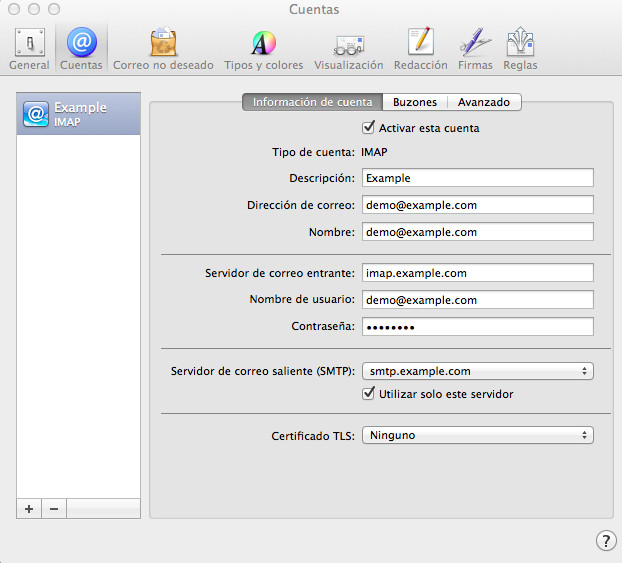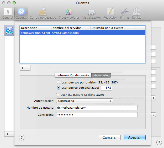 • En Nombre de usuario y en contraseña introducimos los datos de usuario y contraseña que hemos asignado a esta cuenta.