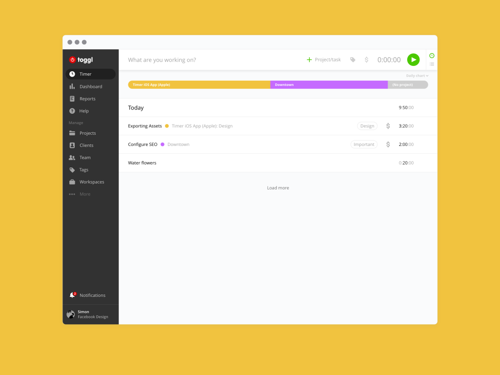 Es un simple cronómetro. Le das al play cuando empiezas a trabajar, puedes pausarlo o pararlo. Añades el texto que describa la tarea que estás haciendo y puedes agruparlo en un proyecto. En cualquier momento puedes retomar de nuevo esa misma tarea sumando tiempo a la misma.