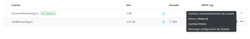 Click en el signo del + de la cuenta en la que quieras crear la redirección y luego en Entrar a Webmail