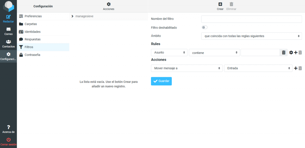 Aquí puedes crear el filtro que redirigirá los emails cuando se cumpla la condición que especifiques. Hay muchas opciones y posibilidades para elegir.