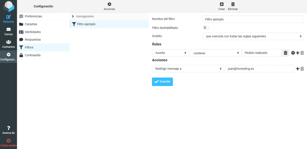 Así sería la configuración para crear un filtro llamado Filtro ejemplo que redirige todos los emails recibidos por la cuenta info@honesting.es a juan@honesting.es cuando el Asunto contiene las palabras Pedido realizado.