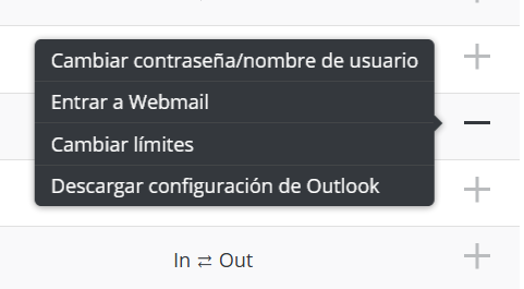 Luego click en el símbolo del + de la cuenta que quieras consultar. Se te abrirá un menú como el siguiente, eligue Entrar a Webmail.