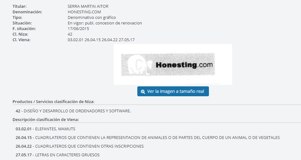 Por ejemplo, Honesting está registrada en la clase número 42 que corresponde a DISEÑO Y DESARROLLO DE ORDENADORES Y SOFTWARE.