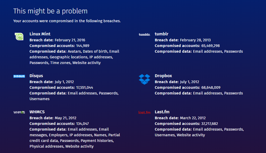 Puedes estar tranquilo porque ninguno de estos hackeos suponen un problema a día de hoy. Si has puesto tu email y has visto como aparecían varias webs, en la mayoría de los casos serán de servicios que no tienen mayor importancia como es el caso de Disqus o Last.fm