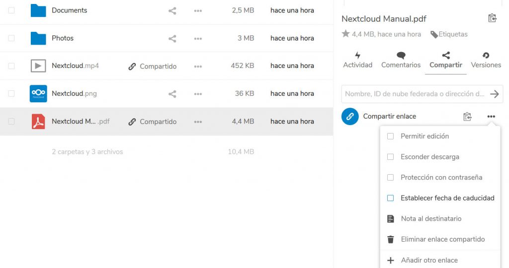 Puedes definir niveles de acceso a los ficheros, contraseñas o fechas de caducidad. También compartir mediante un enlace público.