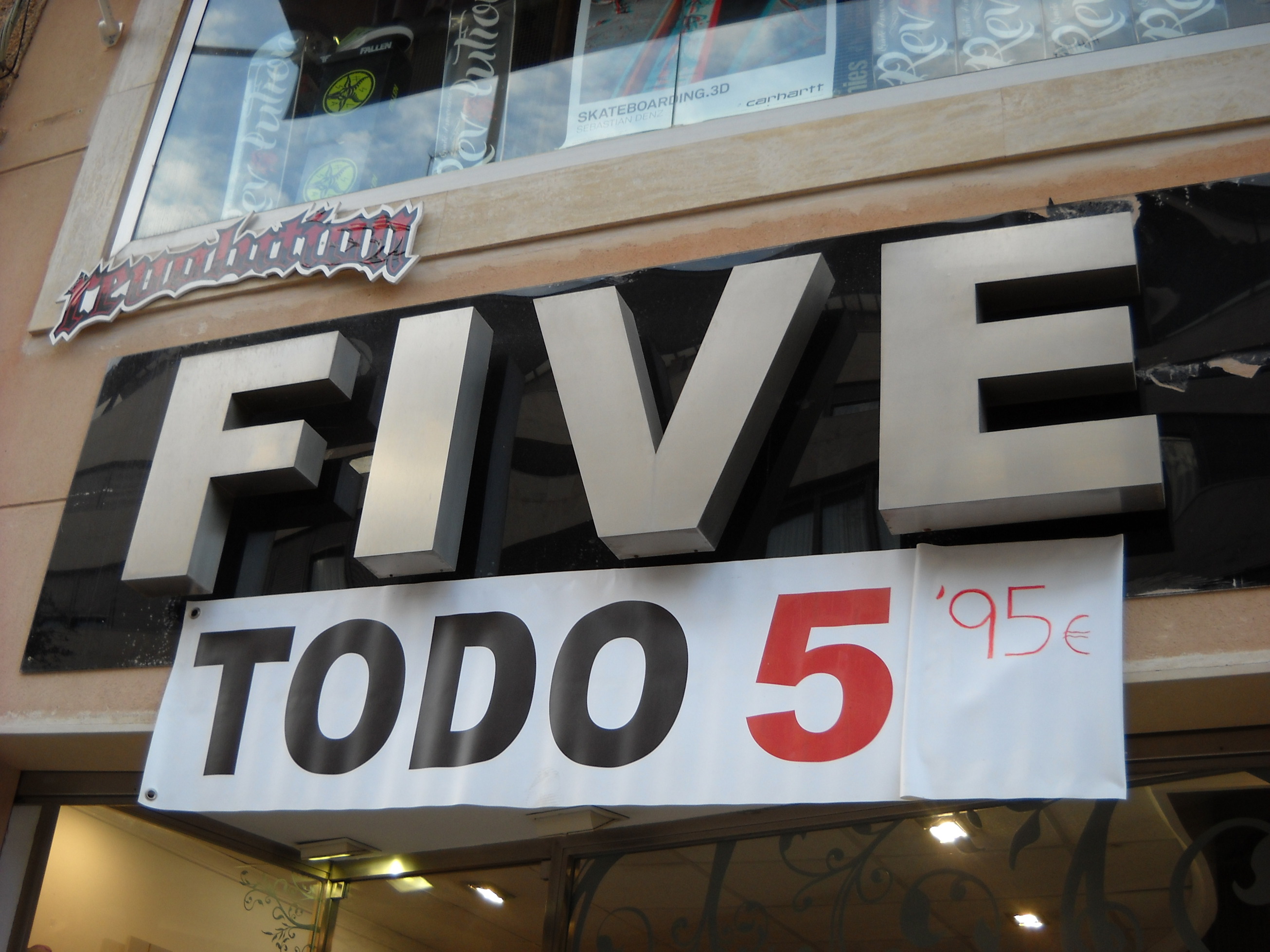 Es de una zapatería. El propio nombre de la tienda es ese, todo a 5€, luego tenía el añadido en rotulador del ,95€