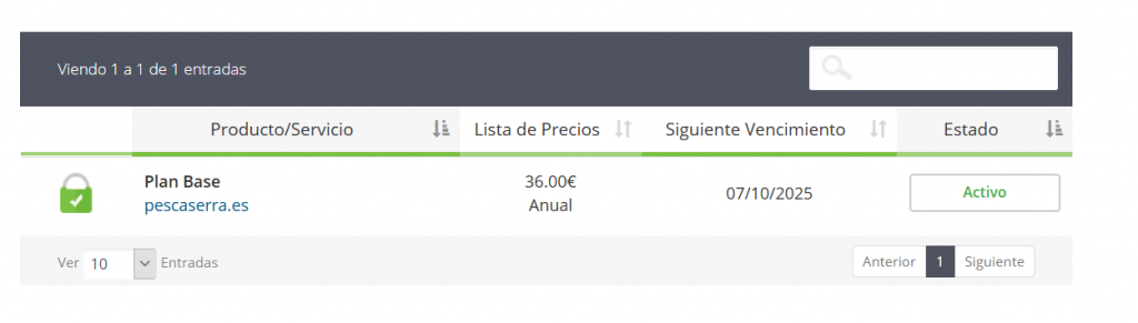 Una vez dentro, entra en el menú superior en Servicios > Mis servicios y haz click en el botón de Activo de tu plan de hosting