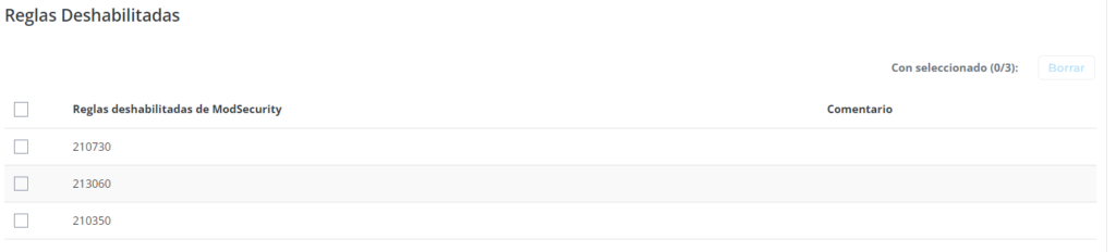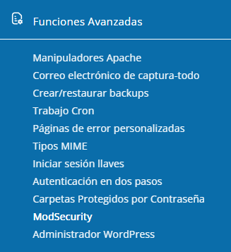 Puedes desactivar una regla concreta de Modsecurity para que no se aplique a tu web, para esto, entra en > Funciones Avanzadas > Modsecurity.