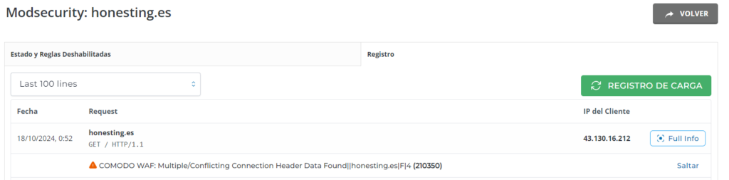 - Log de errores: es el registro de los errores que está generando tu página en el servidor. Si el error es de tipo Modsecurity, puede indicar un conflicto con alguna regla de protección.