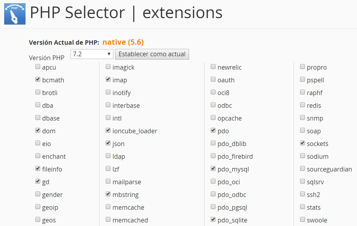 El servidor web está preparado para funcionar con todas las versiones y eres tú el que puede elegir la que más se adapte a tu página web, activando o desactivando módulos sin tener que contactar con soporte técnico con el selector de la versión de PHP.